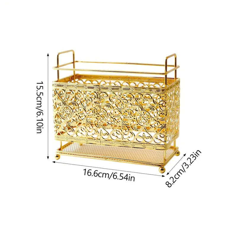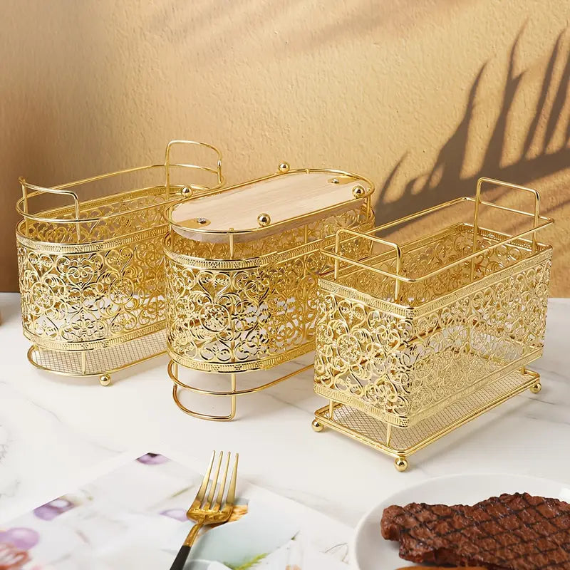 Gold Cast Iron Utensil Holder with Wooden Base (Rectangle Shaped)