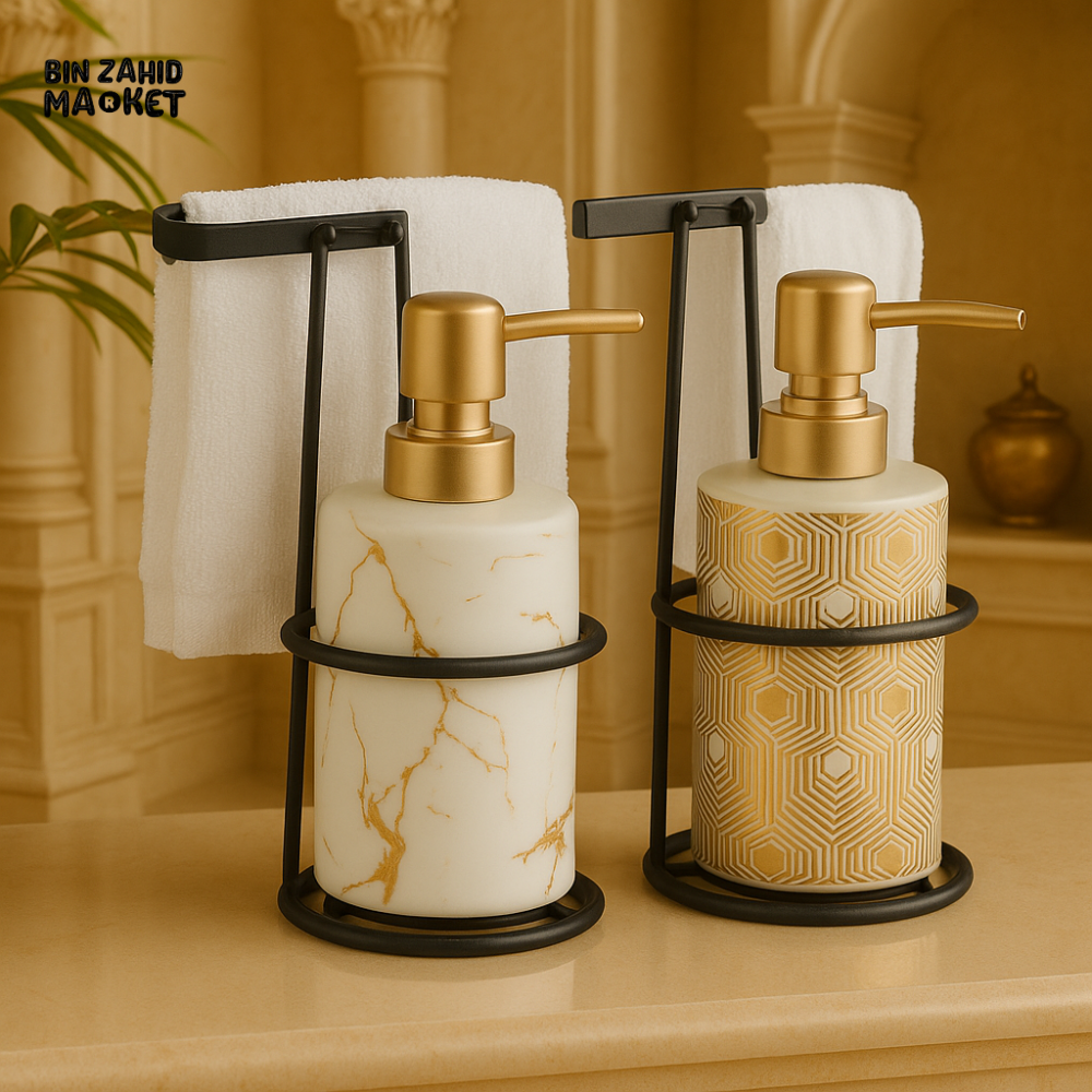 Elevate your bathroom aesthetics with this Luxury Ceramic Soap Dispenser Set, featuring two elegantly designed dispensers with gold geometric and marble patterns. Each piece comes with a built-in black metal towel holder, adding both style and functionality. Perfect for villa bathrooms, guest washrooms, or high-end interiors, these dispensers combine premium ceramic material with a sophisticated gold pump for a truly upscale touch. Ideal for hand wash, lotion, or sanitizer.